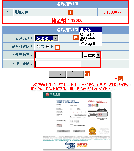 2‧按下一步後,系統將會連線至中國信託刷卡系統,請輸入您的信用卡資料。