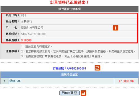 訂單編號:請牢記您的訂單編號,以便日後查詢訂單狀況。下方為您的交易清單。 |