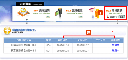 您可點選上方「商城資訊」查詢,若您有加購功能,在此便會顯示所有的選購加值功能資訊。 |