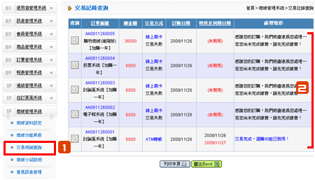 您可點選左方「商城管理系統>交易記錄查詢」。 |